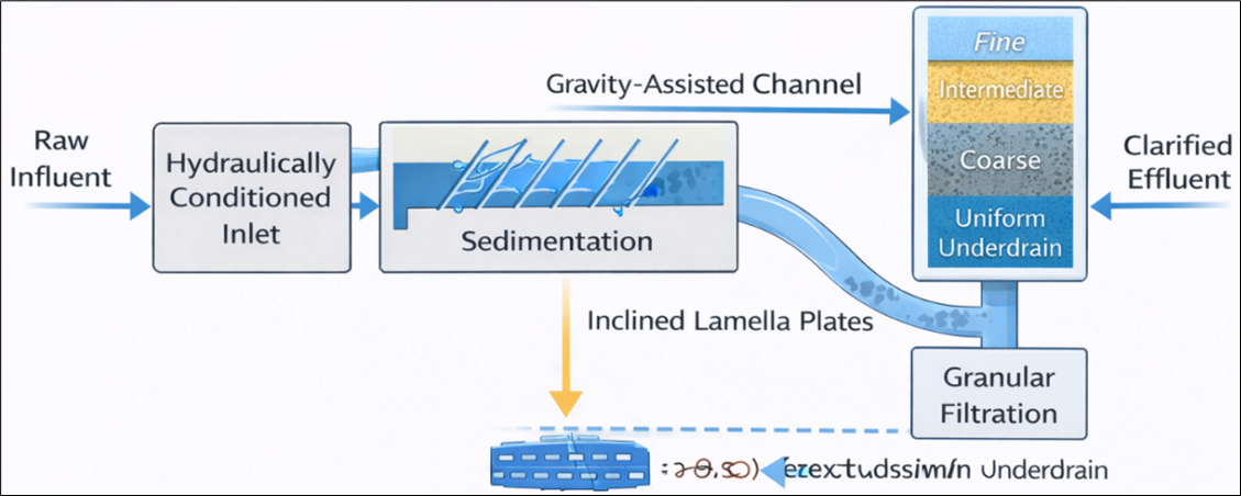 The fact that water treatment usually consumes a lot of energy is an issue of operations as well as of environmental concern especially in the fields of sedimentation and filtration which determine the solid-liquid interactions as well as hydraulic resistance. A complete mechanical design optimization concept is established in order to optimize the efficiency of the treatment process and reduce the head loss and specific energy requirements through the joint redesign of clarifier geometry, lamella settling pattern, and graded porous-media filtration. Calculation of hydraulic and transport principles are accompanied by computational fluid dynamics assessment, multi-objective optimization, in order to determine the energy-efficient design parameters. A prototype laboratory scale is built to confirm the performance predicted at controlled flow and turbidity. Alterations of the placing results of experiments show higher turbidity removal; longer filtration run time; reduced clogging behavior; greater hydraulic head loss reduction and energy usage reduction compared with a conventional baseline arrangement. Between-simulation and experimental findings also indicate that the suggested optimization approach can be reliably applied and that the development of a combined filtering and sedimentation approach should be presented within a common hydraulic framework. The invented solution offers a viable framework of water treatment infrastructure attainment, which is scalable to low-energy and sustainable water management in both decentralized and centralized systems.